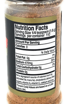 Salt, Dextrose, Spices, Paprika, Chili Pepper, Dehydrated Onion and Garlic, and not more than 2% Silicone Dioxide (added to prevent caking).