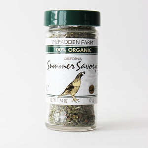 McFadden Farm's Organic Summer Savory is a great addition to vegetable soup and meat broth. It enhances all kinds of bean, meat, fish, egg and pasta dishes. Also excellent in stuffings, sausage and wild game.